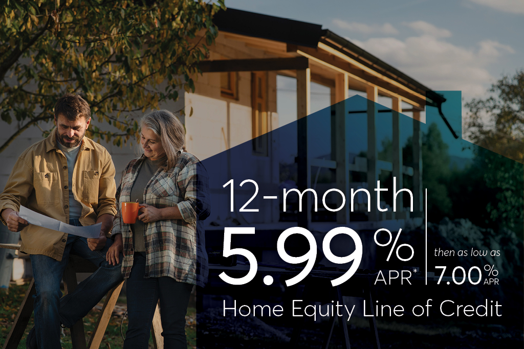 *This promotional, introductory Annual Percentage Rate (APR) applies only to new loans and collateral. Rate is effective as of November 20, 2025. The plan will convert to variable rate after the first 12 months. The APR is based on the WSJ prime rate (currently 7.00%) and may adjust monthly. After the introductory period, the APR can range from 3.25% to 22.99%. Approval and rate may vary based on credit history, term and security offered. Minimum qualifications for the introductory rate include 85% maximum combined loan to value and a minimum credit score of 660. Other restrictions may apply. Early termination fee of $300 if closed within first 24 months. Loan programs, rates, terms and conditions are subject to change at any time without notice. Third party closing fees may apply; contact us for a good faith itemization of such fees. Proof of acceptable homeowners insurance will be required.